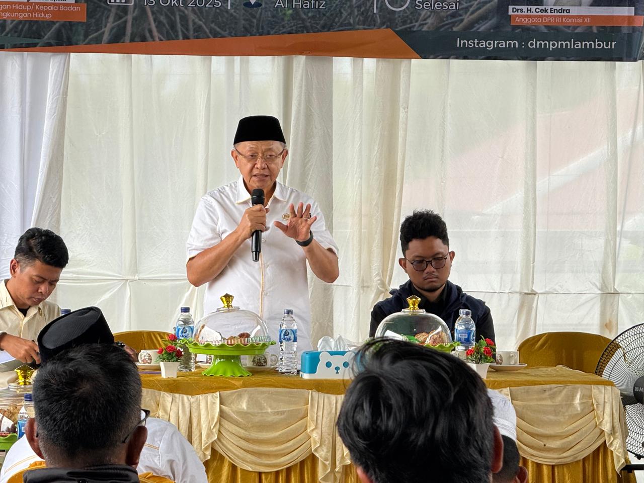 Dalam paparan kuncinya, Drs.H. Cek Endra menyoroti penyebab utama kegagalan restorasi selama ini. Ia menegaskan, tingkat kegagalan penanaman mangrove di pesisir yang terabrasi parah sangat tinggi. Menanam bibit di kawasan dengan energi ombak yang kuat adalah pemborosan besar karena bibit akan mudah tercabut sebelum sempat berakar.